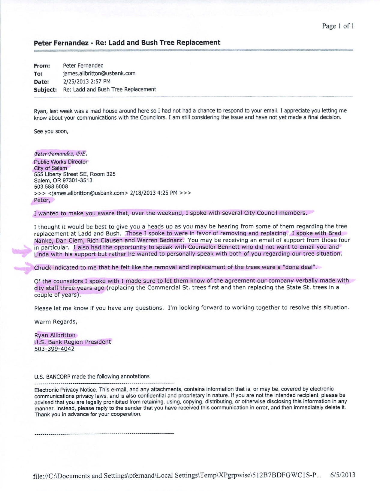 Below is a February 18, 2013 email sent by U.S. Bank president Allbritton to Public Works Director Fernandez.
