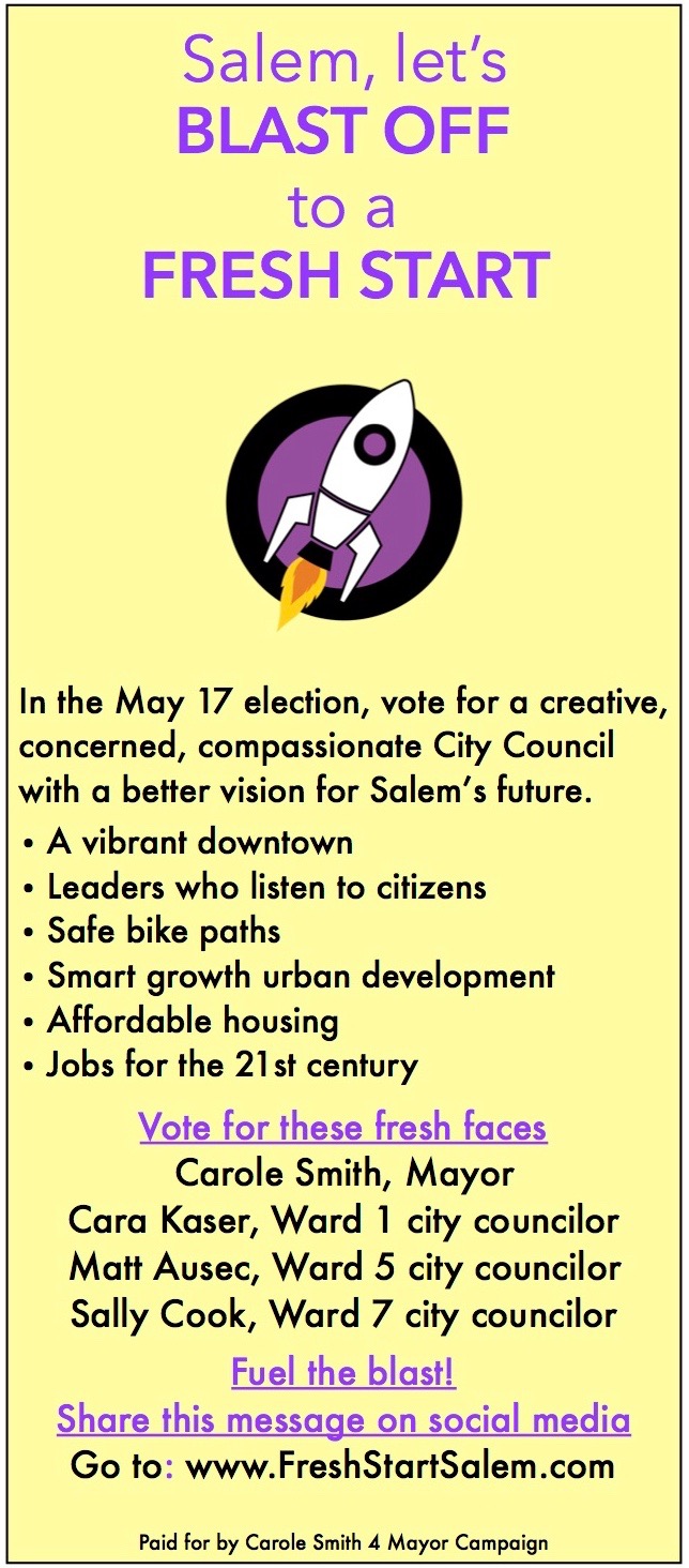People power can elect a new Mayor and three city councilors in the May 17, 2016 election who are committed to a fresh start for Salem. We all know how much untapped potential lies dormant in this town, ready to blossom when City leaders involve people, listen to people, say YES! to people with great ideas.