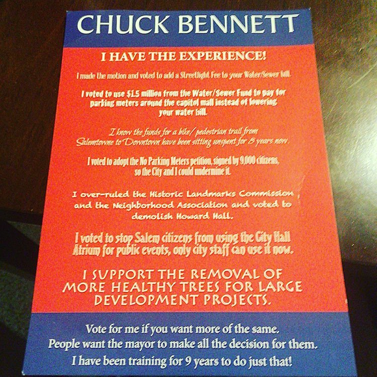 Now Bennett is complaining about an anonymous mailer that's been received by Salem voters. I'm not sure why this deserved a story in the Statesman Journal, given that the mailer is (1) completely legal, and (2) truthful.