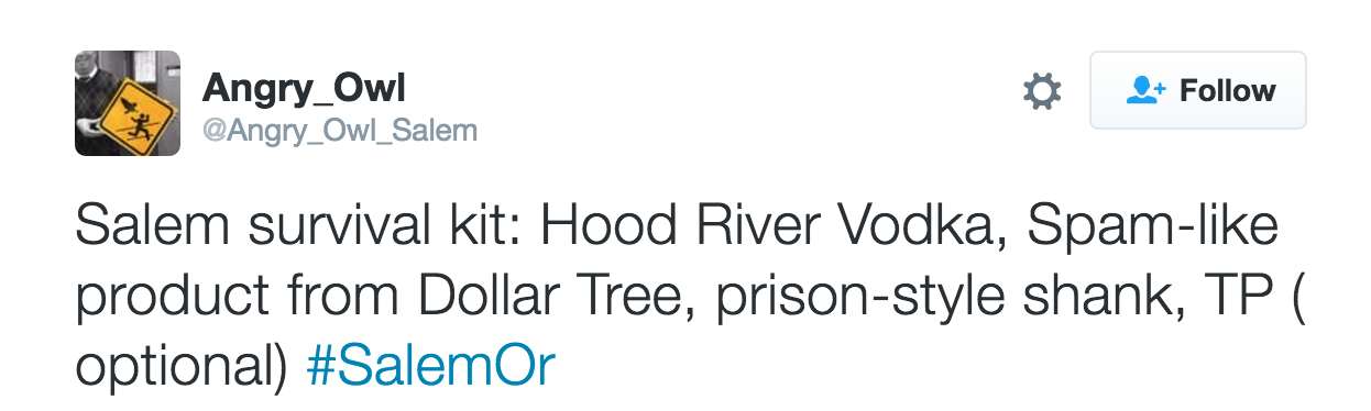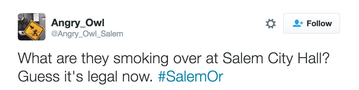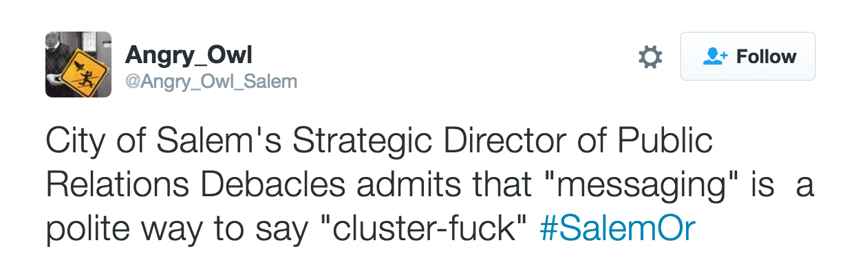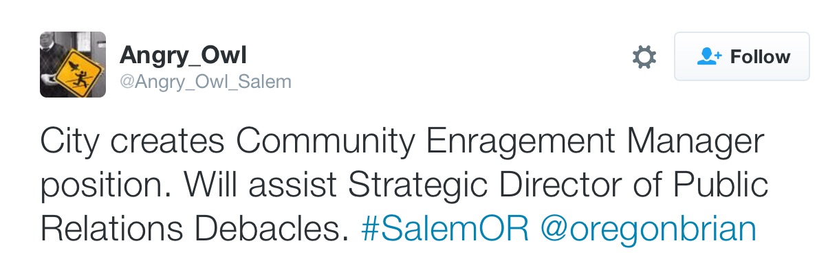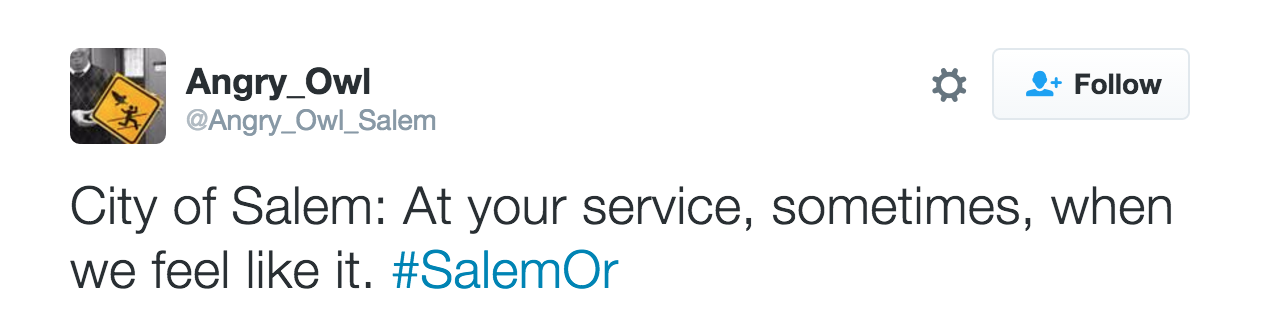 This was the tweet that caught my attention recently. My @oregonbrian Twitter handle was included in it, since Angry Owl knows how much I enjoy humor directed at the City of Salem. (Some of my blog posts also provided material for Angry Owl.)