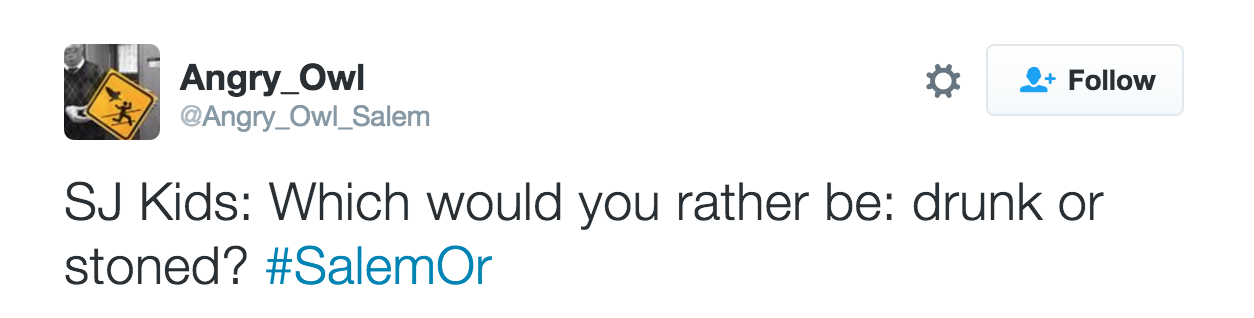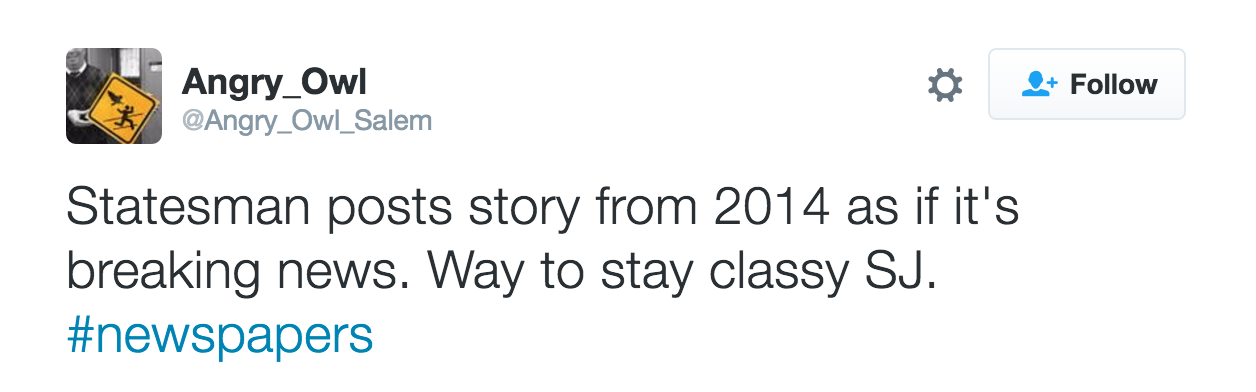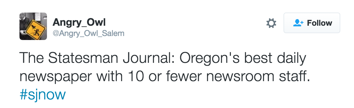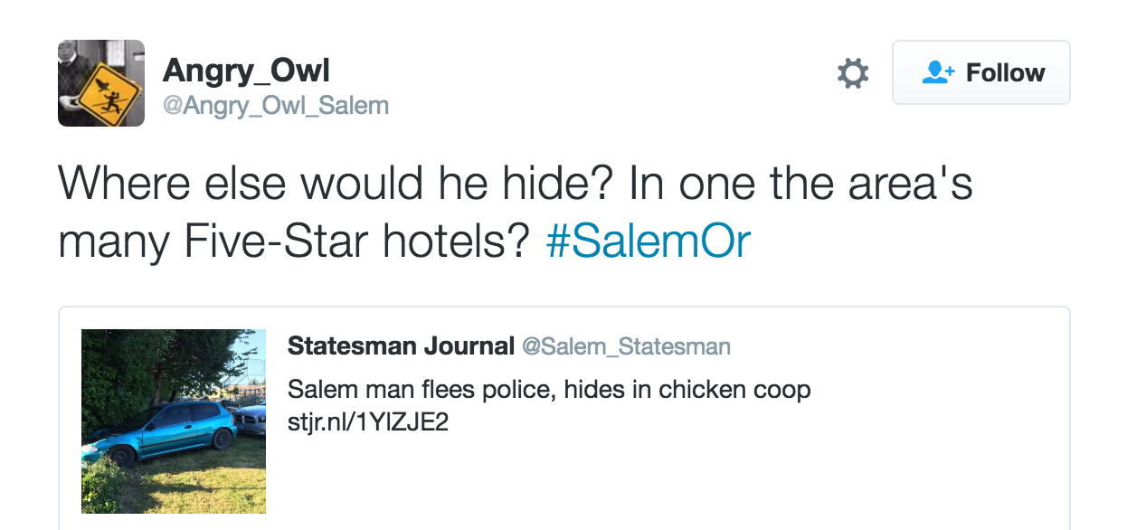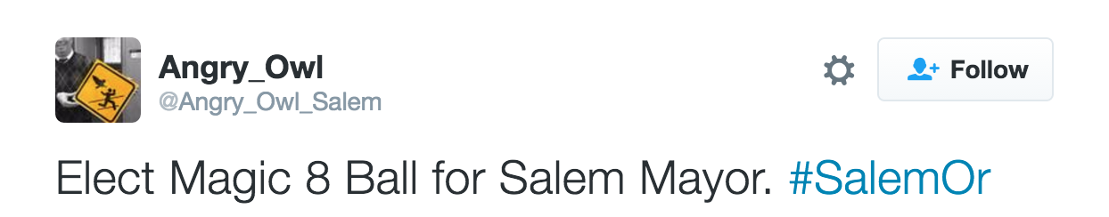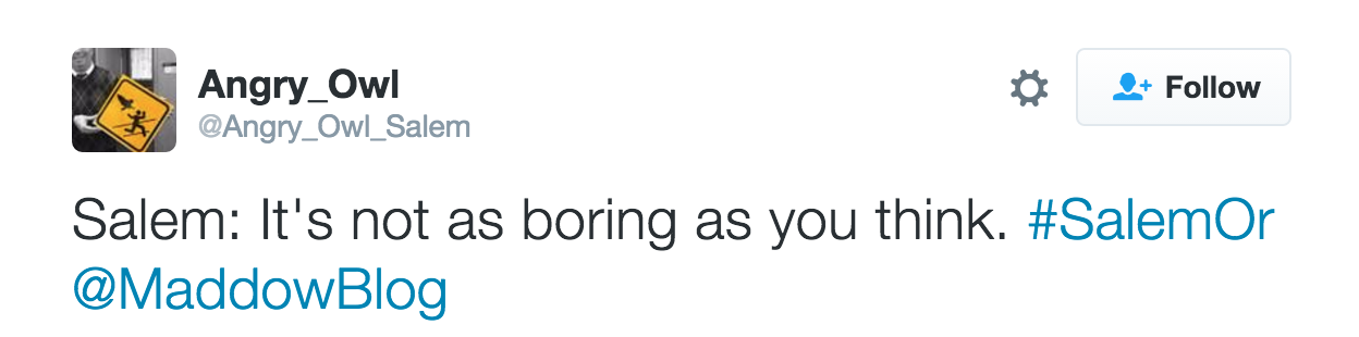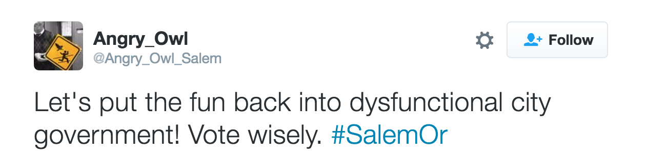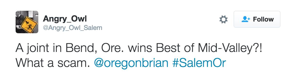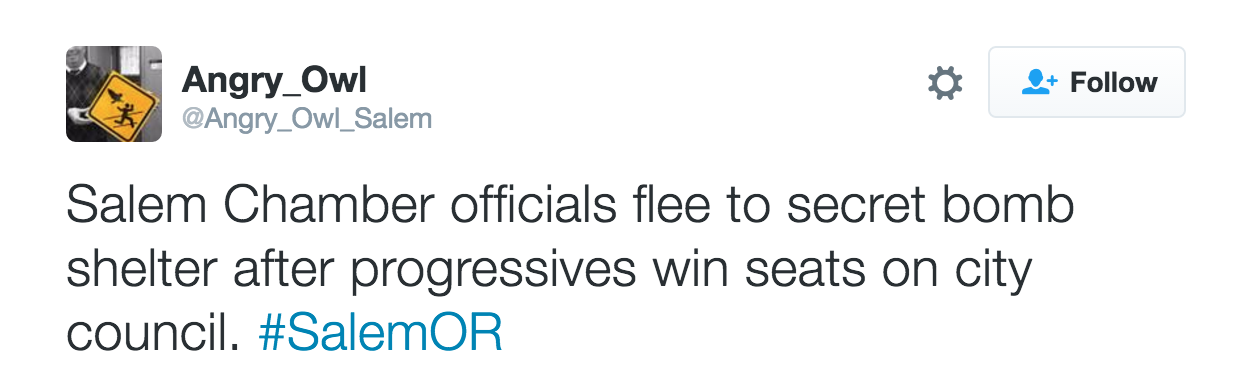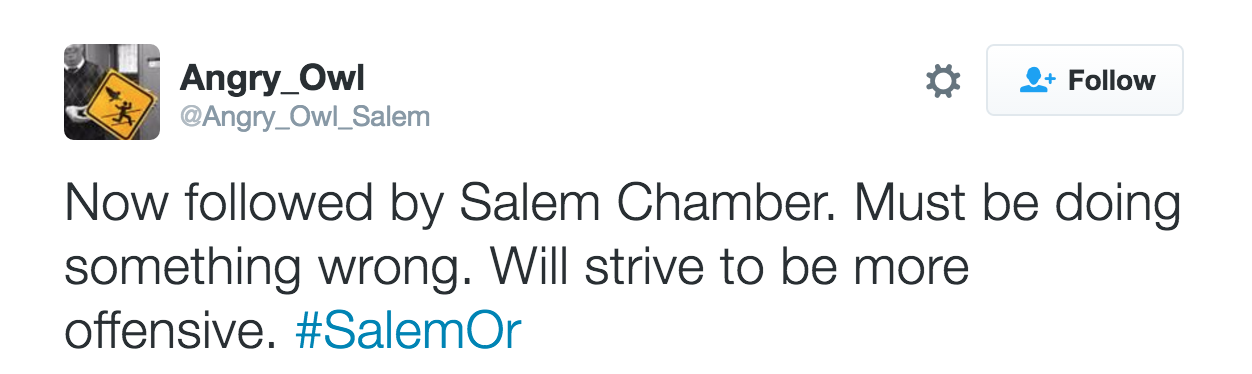 Below are some good additional tweets from the past three months or so. I appreciate Angry Owl's focus on the Statesman Journal, Chamber of Commerce, and other subjects that deserve satirical birdsong.