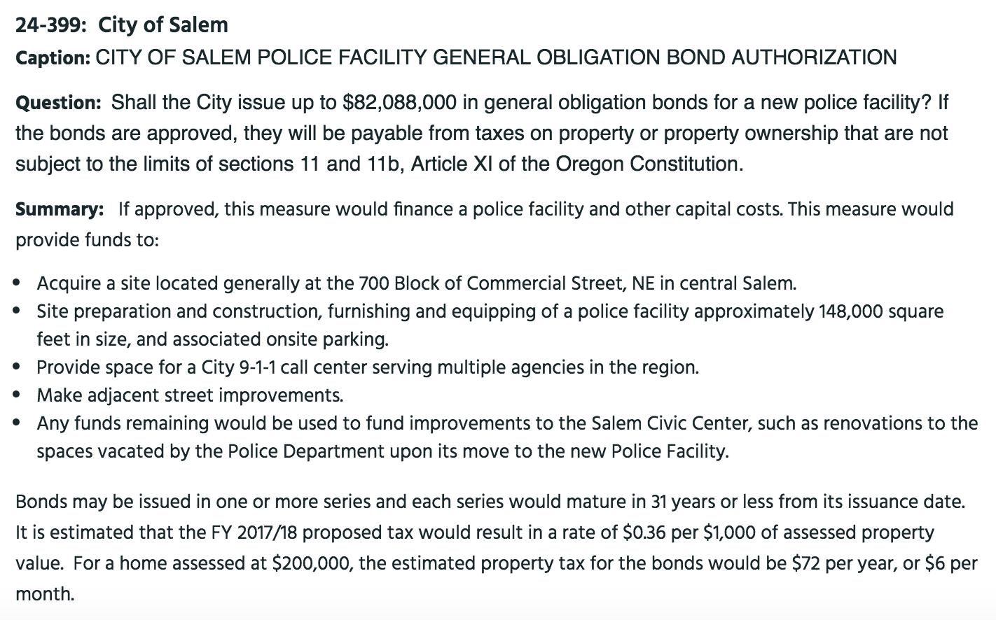 So, as expected, this November Salem voters will be asked whether they want to approve $82,088,000 in general obligation bonds to pay for a new 148,000 square foot police headquarters on the old O'Brien auto dealership site just north of downtown.