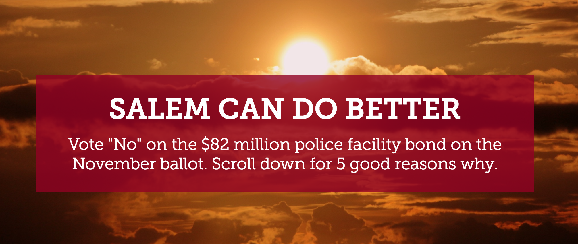 There are very good reasons to reject the City of Salem's poorly-thought-out, overpriced, oversized police facility plan. A Salem Can Do Better web page lays out five reasons to vote "No" on the $82 million bond measure. Plus, a bonus reason.