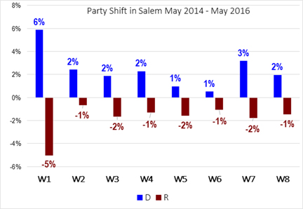 In her new analysis Calos looked at the change in party affiliation (Democrat and Republican) in the past two years in the eight Salem City Council wards. What she found is that Democrats have increased their registration in all eight wards.