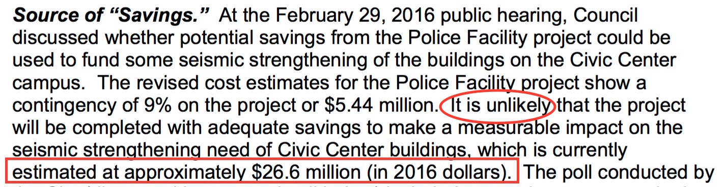 Powers notes that given the amount of contingency funds in the $82 million budget — $5.4 million — "it is unlikely that the project will be completed with adequate savings to make a measurable impact on the seismic strengthening need of Civic Center buildings, which is currently estimated at approximately $26.6 million (in 2016 dollars."
