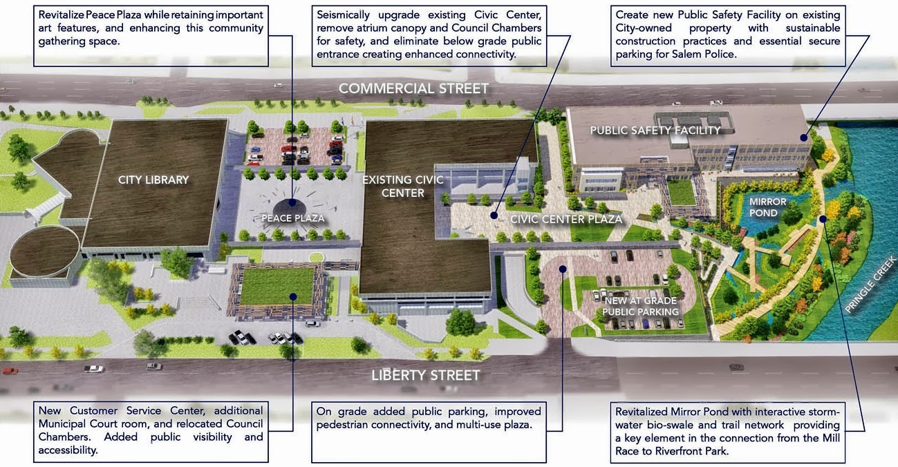 The 1970s civic center is uninviting and confusingly designed. Should Salem have a smaller city hall, with drive-thru convenience, and make better use of online portals and video interaction for serving residents and businesses? Likewise, how would a 21st century library be best designed to serve the community?