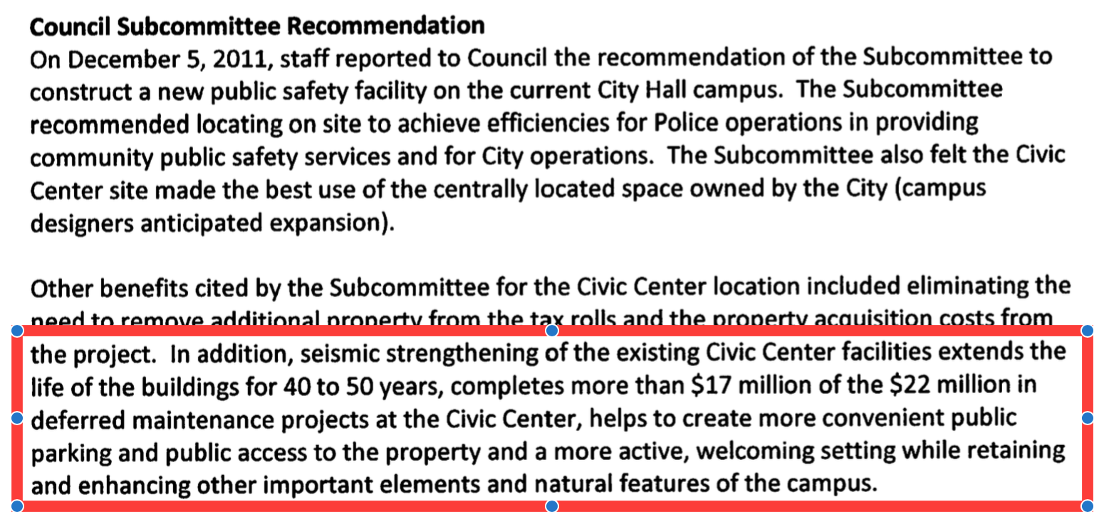 As you can see, it says that in 2011, a City Council subcommittee concluded that "seismic strengthening of the existing Civic Center facilities extends the life of the buildings for 40 to 50 years, completes more than $17 million of the $22 million in deferred maintenance projects at the Civic Center, helps to create more convenient public parking and public access to the property and a more active, welcoming setting while retaining and enhancing other important elements and natural features of the campus."