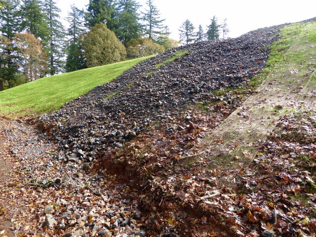 The excavation company that did the grading finally came out to check on the landslide yesterday. Their solution was to throw gravel at everything – even though there was still standing water on the driveway, they did nothing to drain it. It was at least a foot deep yesterday afternoon.