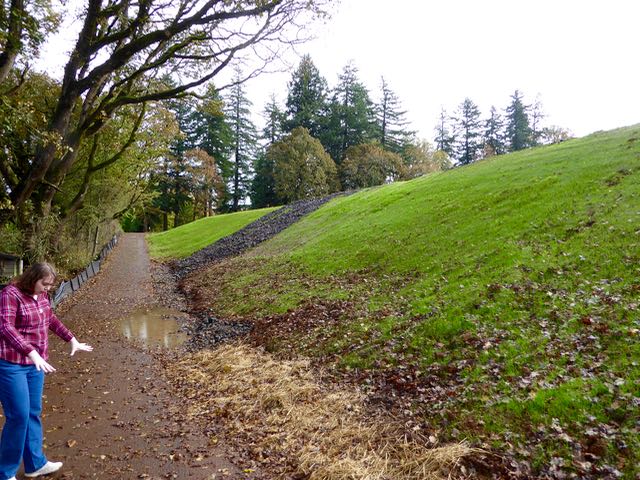 Over this last weekend, when the torrential rain hit, a large section of the artificial hill collapsed. Four feet of mud slid down and caked both the driveway and our next-door-neighbor’s backyard. Our neighbors who live in the 1920s house were trapped in their house during a massive storm. When they tried to leave the next day, their car got stuck and it took almost three hours for Triple-A to get them out.