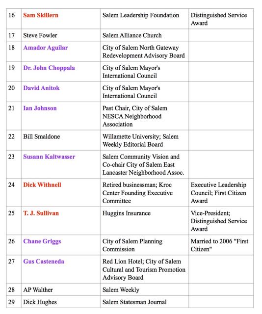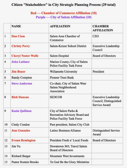 Jim was struck by how many of the 29 "community group leaders" had connections with the Salem Chamber of Commerce. He researched what those connections were and shared the resulting document with me. I then did my own Googling, which led to some editing of Jim's work.