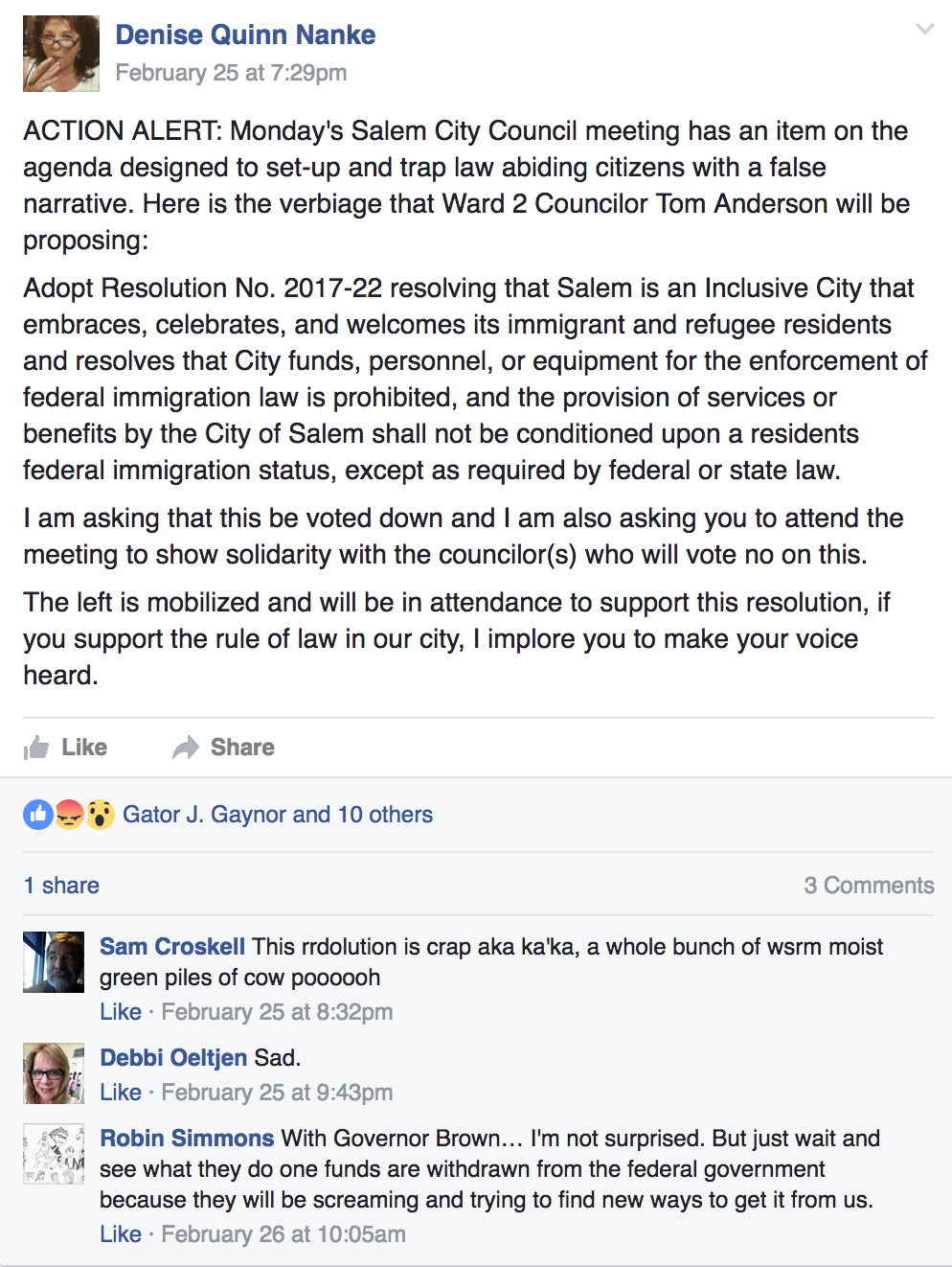 Councilor Nanke's wife, Denise, tried to drum up opposition to the Inclusive City resolution via the Oregon Republican League Facebook page. (She co-hosts a right-wing radio talk show with Gator Gaynor.) That effort obviously flamed out, since only two people testified against it. But Denise Nanke did her best to rouse the conservative masses.