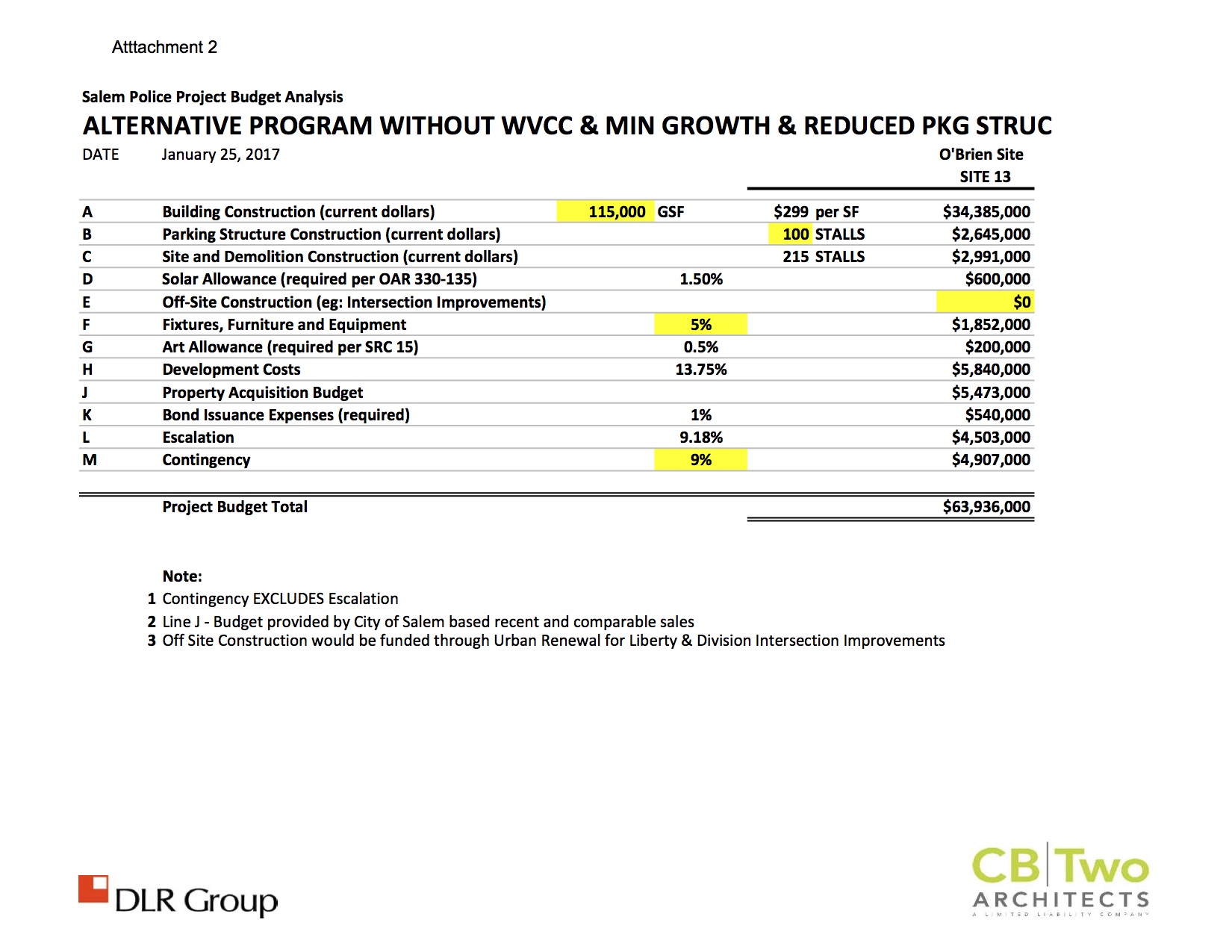 Two down-sized police facility proposals were put forward by City of Salem staff: (1) a 115,000 square foot plan that costs $64 million, and (2) a 127,000 square foot plan that costs $69 million. See: