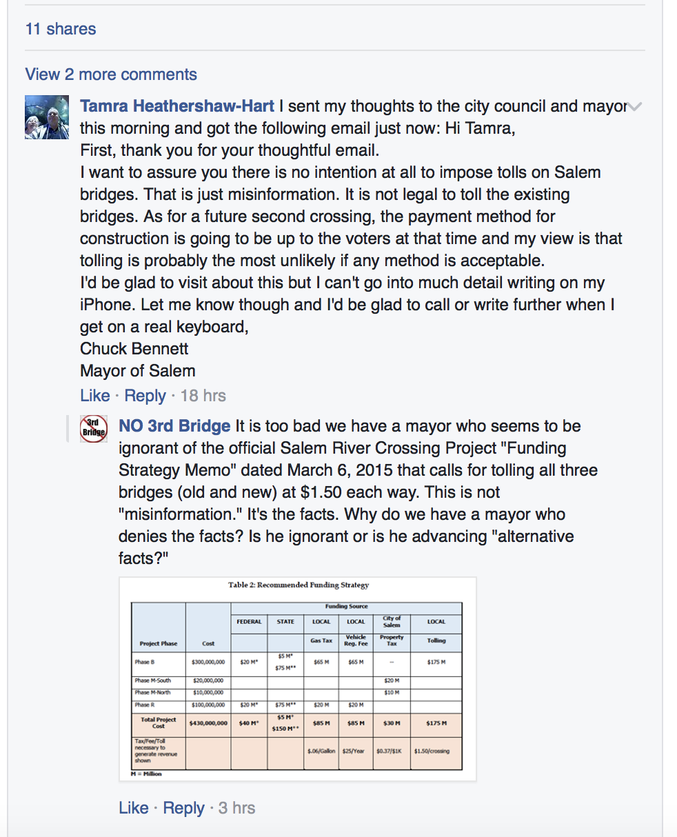 Mayor Bennett is going backwards, truth-telling-wise, on the City of Salem's false contention that there is no plan to toll any of Salem's bridges. Friday I blogged about the original falsity in "'Alternative Facts' in City of Salem Facebook post about 3rd Bridge tolls."