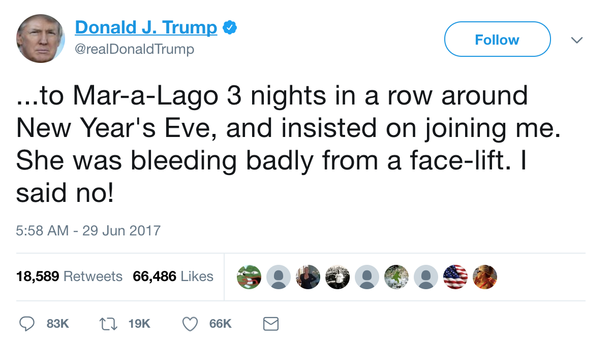 The tweets are only interesting insofar as they provide an outward manifestation of the inner workings of our president's mind. Since we've had plenty of insights into Trump's dark, twisted, egomaniacal psyche, I really don't need in-depth coverage of these two tweets, which should be ignored rather than amplified.