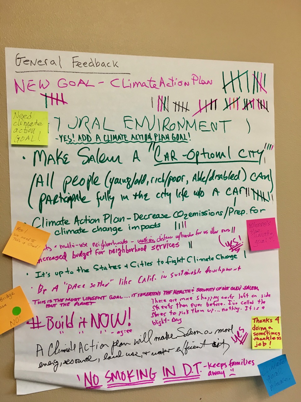 People could write comments about existing Strategic Plan goals on sheets of paper stuck on the walls. This sheet was used to show support for a Salem Climate Action Plan. Forty-six people had added a checkmark supporting "New Goal – Climate Action Plan."