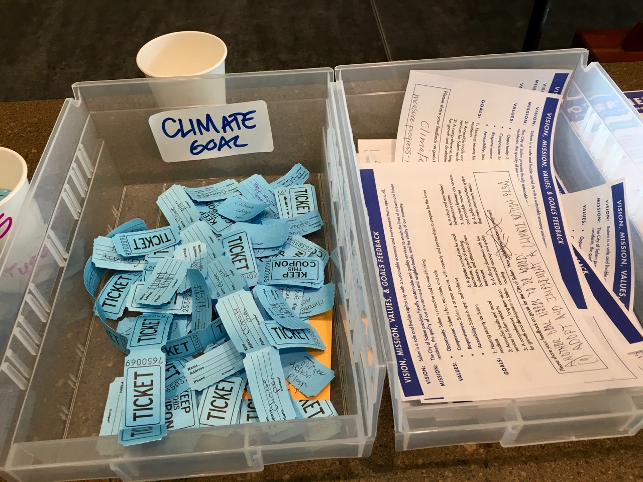 Nearby, a couple of trays were filled with tickets Strategic Plan open house attendees had been given to show their support for favored goals, and with feedback forms urging adoption of a Climate Action Plan.