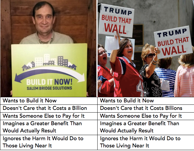 There is a new Chamber of Commerce-funded "astroturf" (fake grassroots) group called Salem Bridge Solutions that is making a lot of noise lately. We think that they have a lot in common with people who support our President's crazy border wall idea. What do you think?