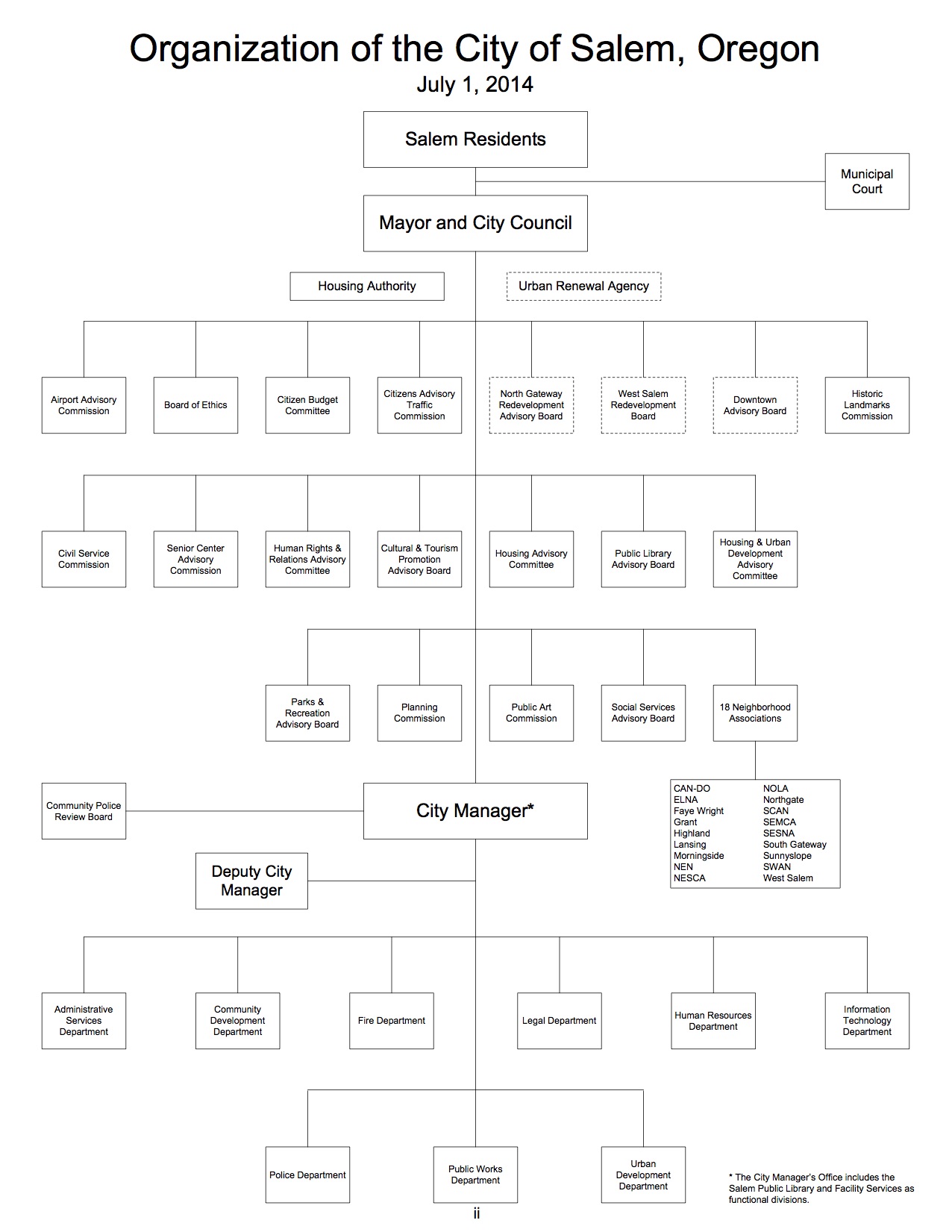 We see that the general notion is Salem residents are at the top of the organizational pecking order, because they elect the Mayor and City Councilors — who then select a City Manager who is responsible for hiring other city staff and administering the various city departments.