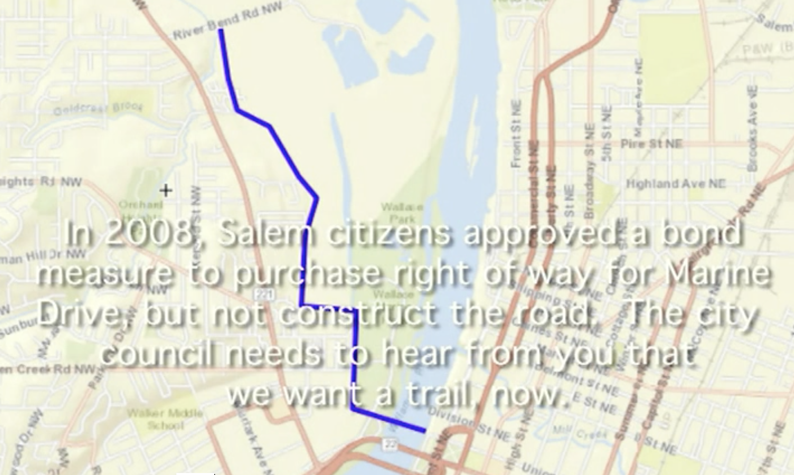 I talked about how the Salemtowne to Downtown multiuse path along the Marine Drive right of way would be built by volunteers. And as Councilor Tom Andersen said last night, obviously the path would go away when the $30 million or so needed to construct Marine Drive becomes available — since the plan for Marine Drive includes a multiuse path and bike paths.
