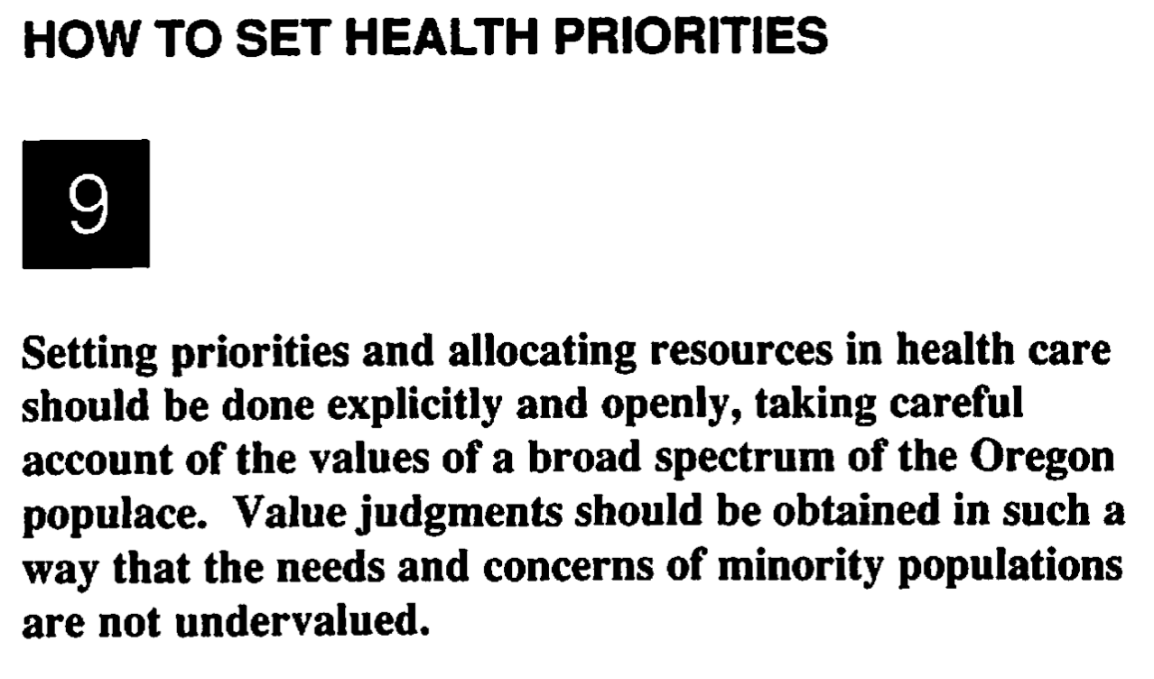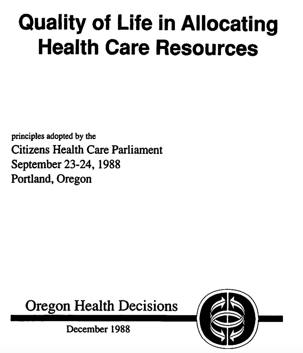 Many years ago, twenty-nine of them, I was the lead staff person for an Oregon Health Priorities for the 1990s project. In 1988 it culminated in a Citizen's Health Care Parliament organized by Oregon Health Decisions, which is still in existence (I was the first executive director of Oregon Health Decisions).