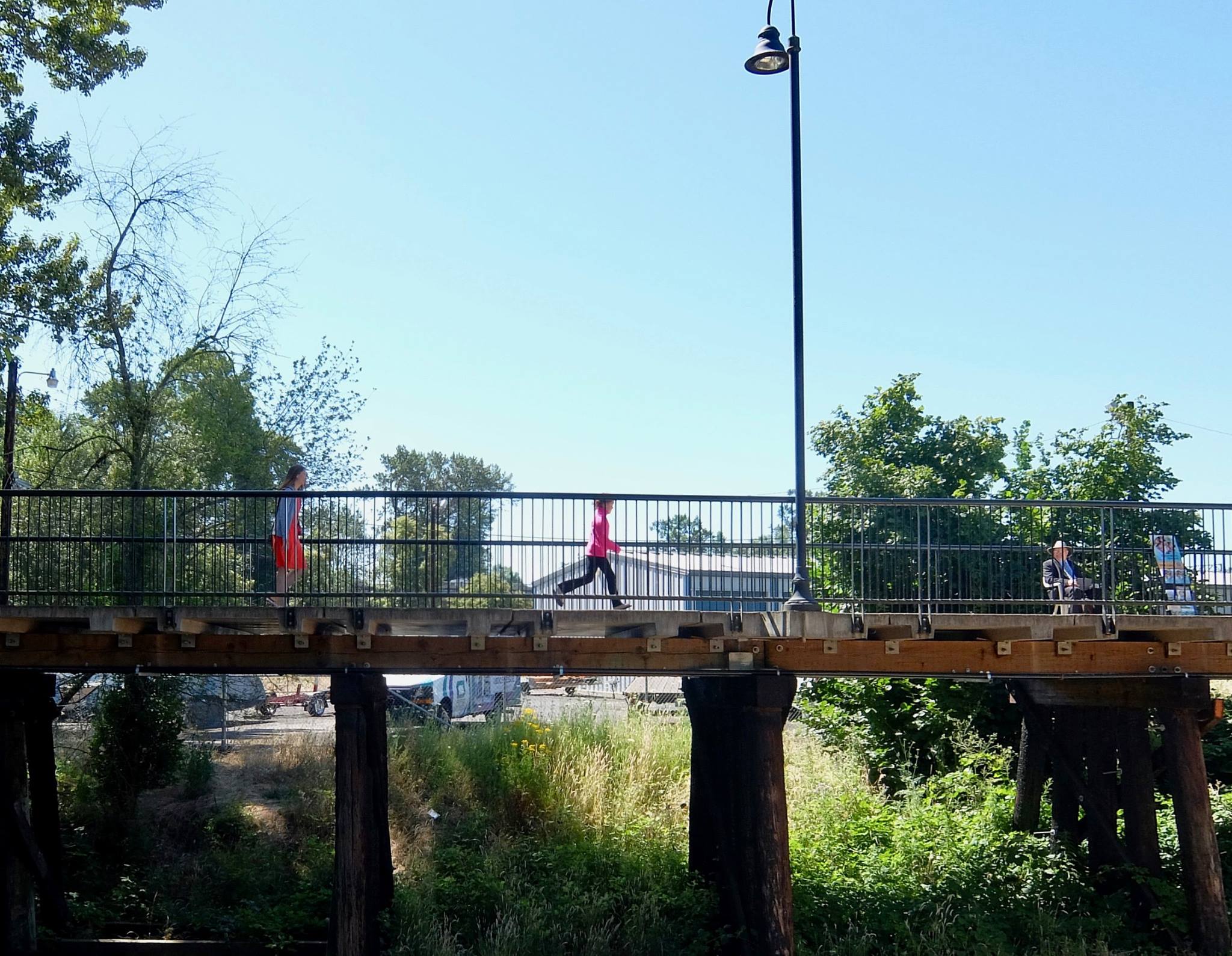 The Federal Highway Administration thinks so. The Salem B. S. [Bridge Solutions] people think so. Do you? The plan is to route heavy freight and other traffic on an elevated ramp that would cover the Union Street Pedestrian and Bicycle Trail for 150' at an elevation of 10-15' from the surface of the trail. That would put it about 10 feet over this girl's head. Would you use this trail if a highway was built on top of it?
