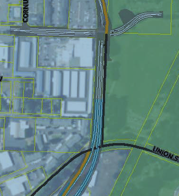 An elevated bridge connection would pass about 10-15 feet over the west end of the Union Street Railroad Pedestrian and Bicycle Trail — the way-cool non-vehicular bridge used by lots of people, including families with children, every day.