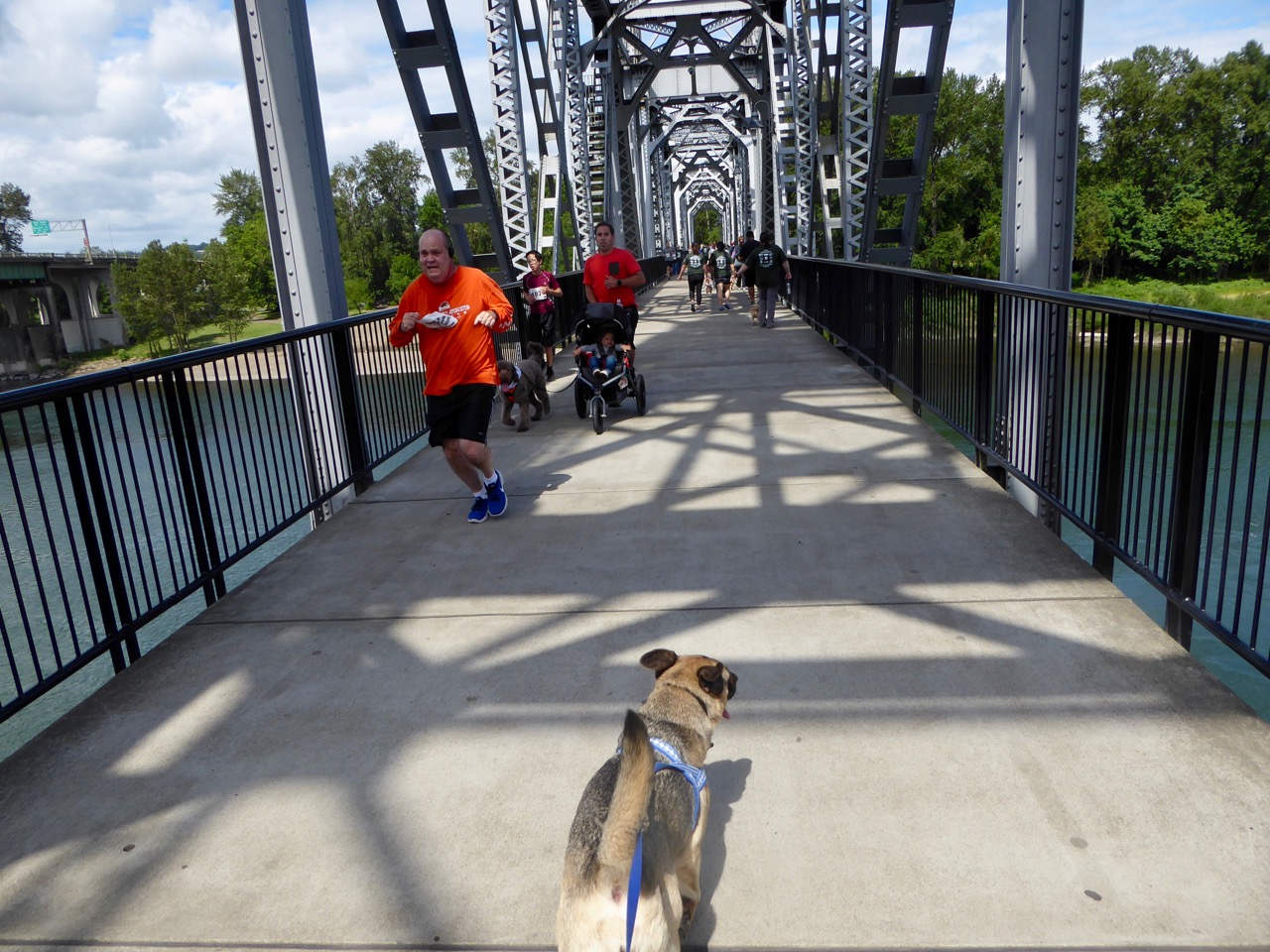 Here's a photo I took during last month's WillaMutt Strut event sponsored by the Willamette Humane Society. ZuZu, our dog, and I are facing toward Wallace Marine Park — where the elevated bridge roadways would pass right through the park and over the Union Street Pedestrian Bridge we were on.