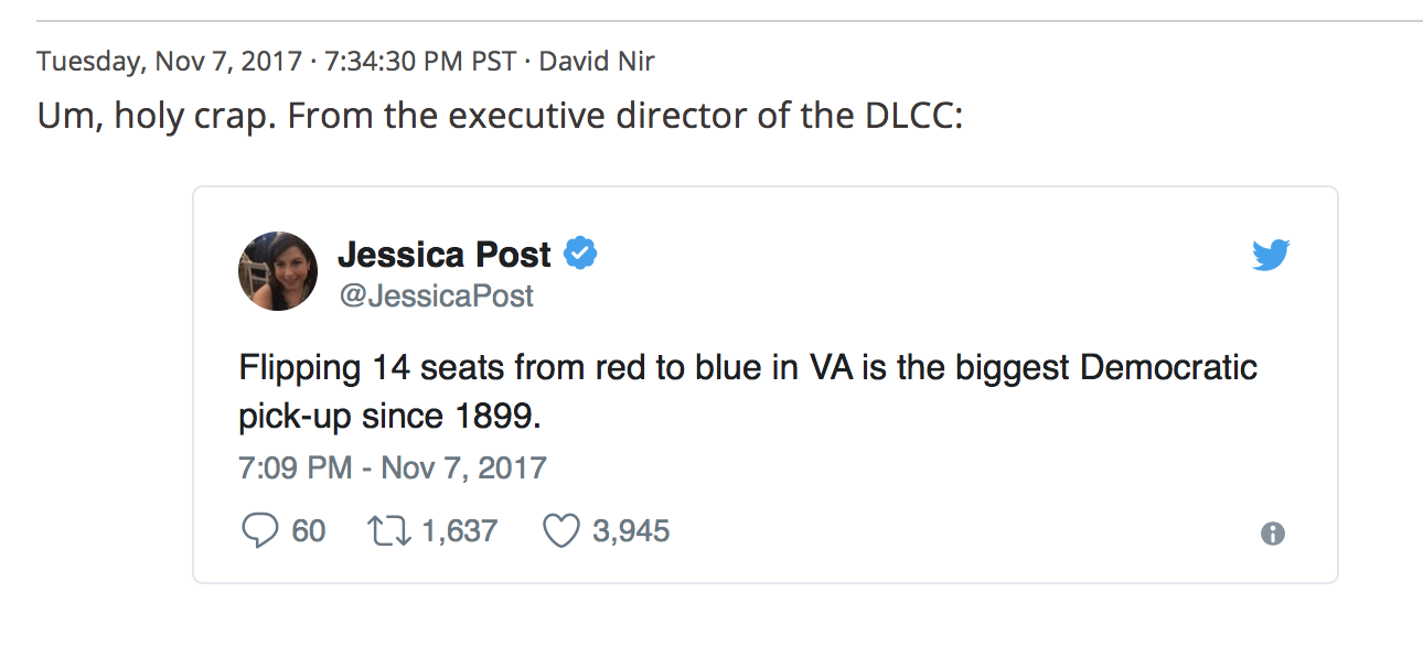 (5) This is truly astounding, the Virginia results, as shown in the "holy crap" Daily Kos reaction to a tweet. If true, and I have no reason to believe what Jessica Post said is false, the Democrats have flipped more seats in Virginia at any time since 1899.