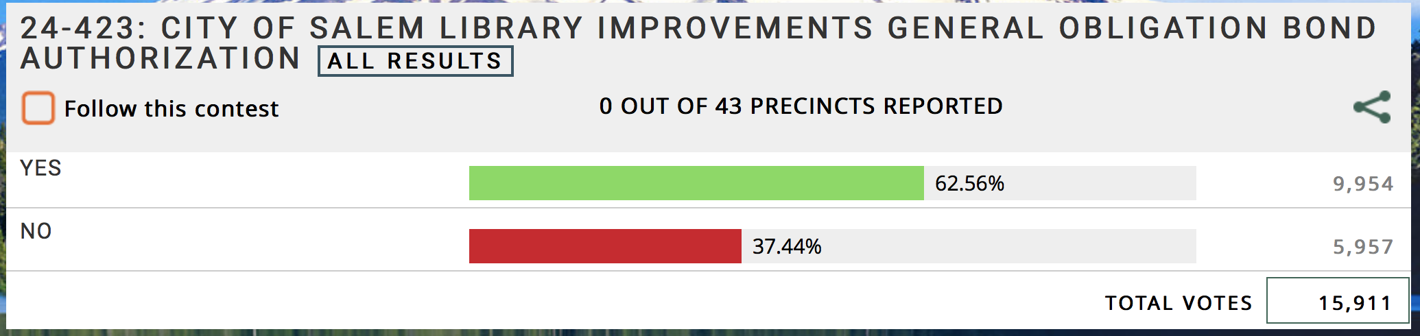(1) Closest to home, the Salem Library Bond passed handily, 63-37 in the first big round of results. OK, this wasn't exactly a Dem victory, but the progressives on the Salem City Council were most in favor of making the Library earthquake-safe when the subject was discussed last year. And it's well recognized that reality has a liberal bias, so approving money for a place that deals in facts counts as a progressive win for me.