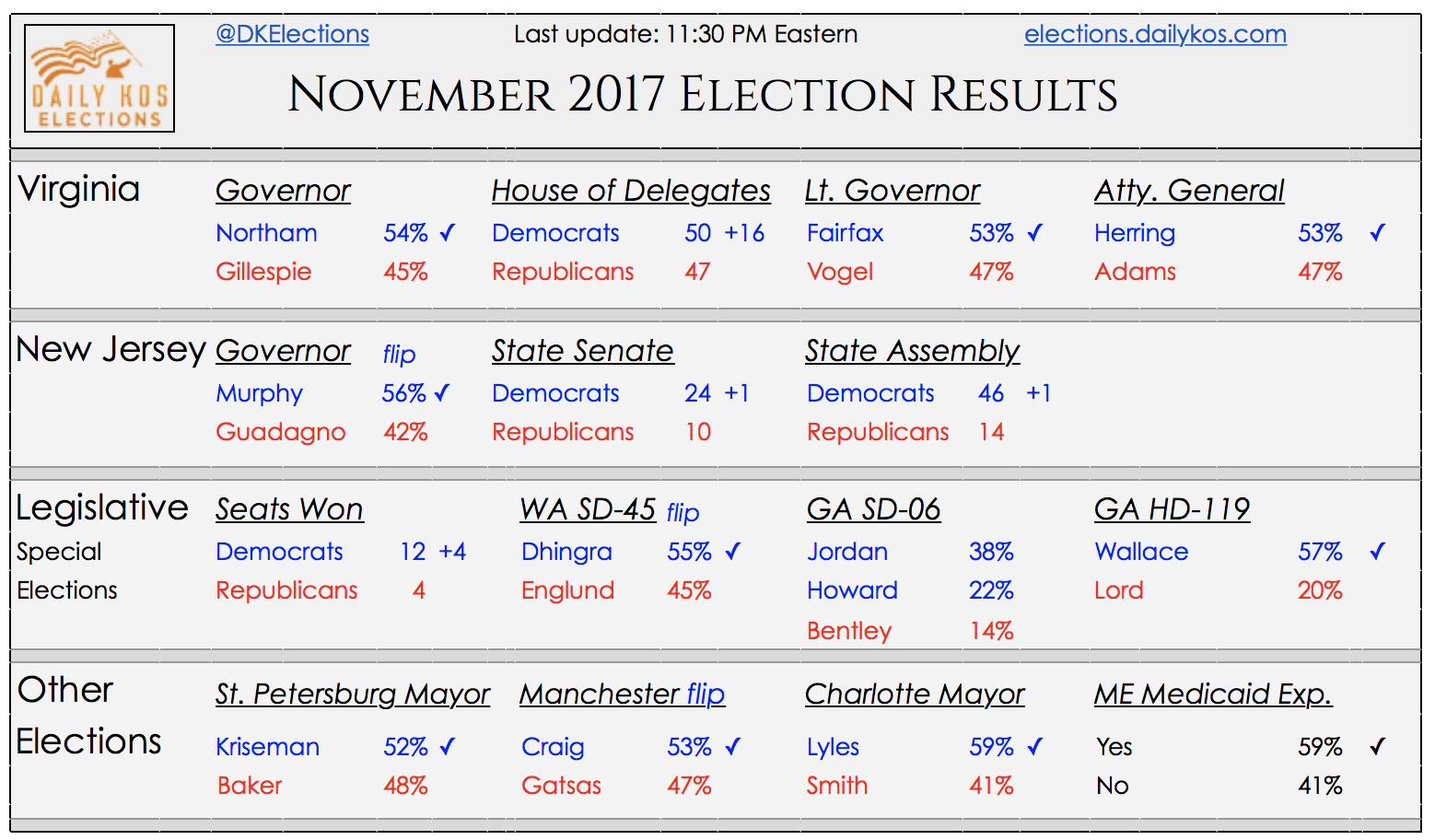 (4) Even more surprising is how well Democrats did in the 100 seats up for grabs in the Virginia House of Delegates. Before tonight it seemed unthinkable that the Dems could gain the 17 seats needed to give them a majority. But Daily Kos is reporting that currently Dems have gained 16 seats, giving them at least a tie (50 seats) in the House of Delegates. Depending on how recounts go, they could still gain 17. See above.
