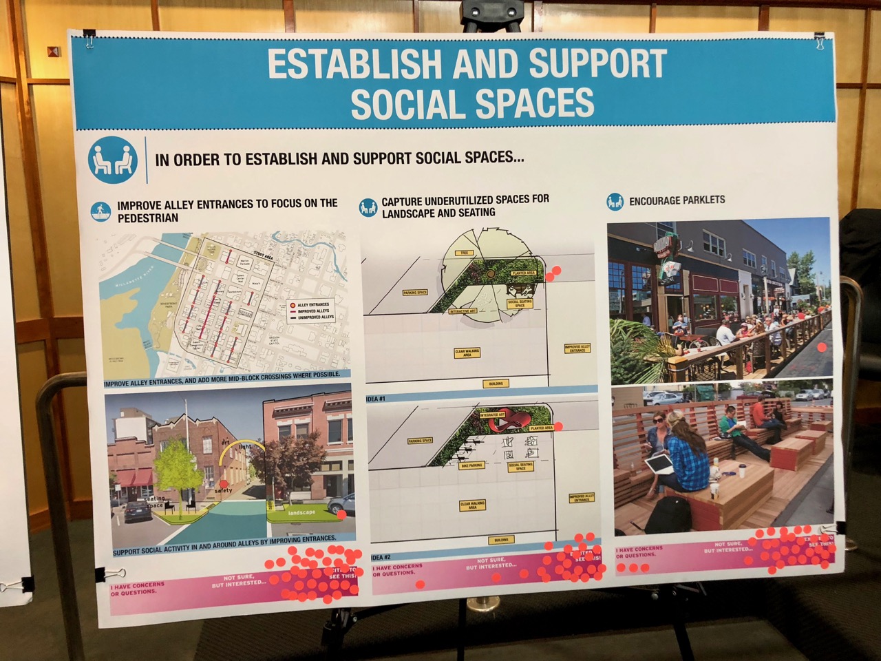 You can see that each of the ideas got many orange spots on the "I like" side, aside from a few people who didn't like the idea of using some spaces for parklets. Note how many people can enjoy a few parking spaces that otherwise would have an empty car sitting in them.