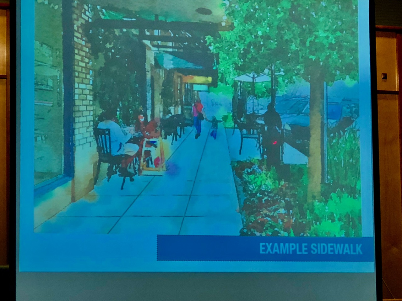 There aren't any "sandwich boards" cluttering up the sidewalk, as currently is the case around Liberty and Court streets. Plantings provide a buffer between people and cars. Sidewalk table seating is adjacent to the business/restaurant, rather than next to the street. All good ideas.