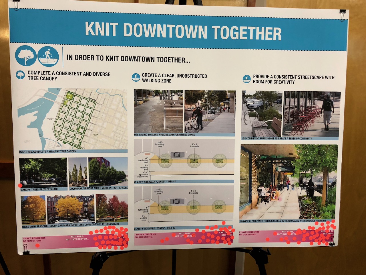 Here's the Knit Downtown Together board. Again, more trees, a clear unobstructed walking zone, consistency and creativity in the streetscape design. All laudable goals — which would be easier to achieve if the sidewalks were wider and the streets were narrower.