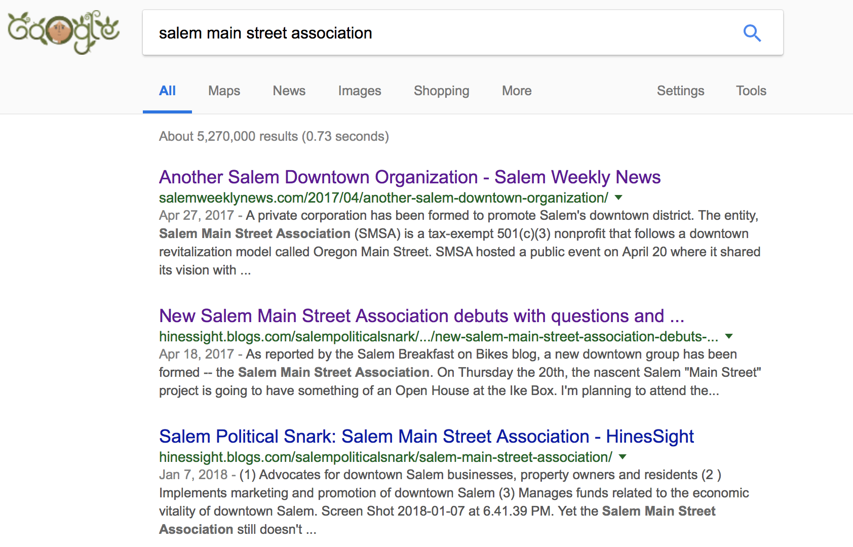 The Salem Main Street Association still has no discernible accomplishments, nor any online presence, or any sign that it is reaching out to downtown business owners or citizens in general. Here's what pops up from a Google search: a Salem Weekly story and links to my blog posts about the organization.