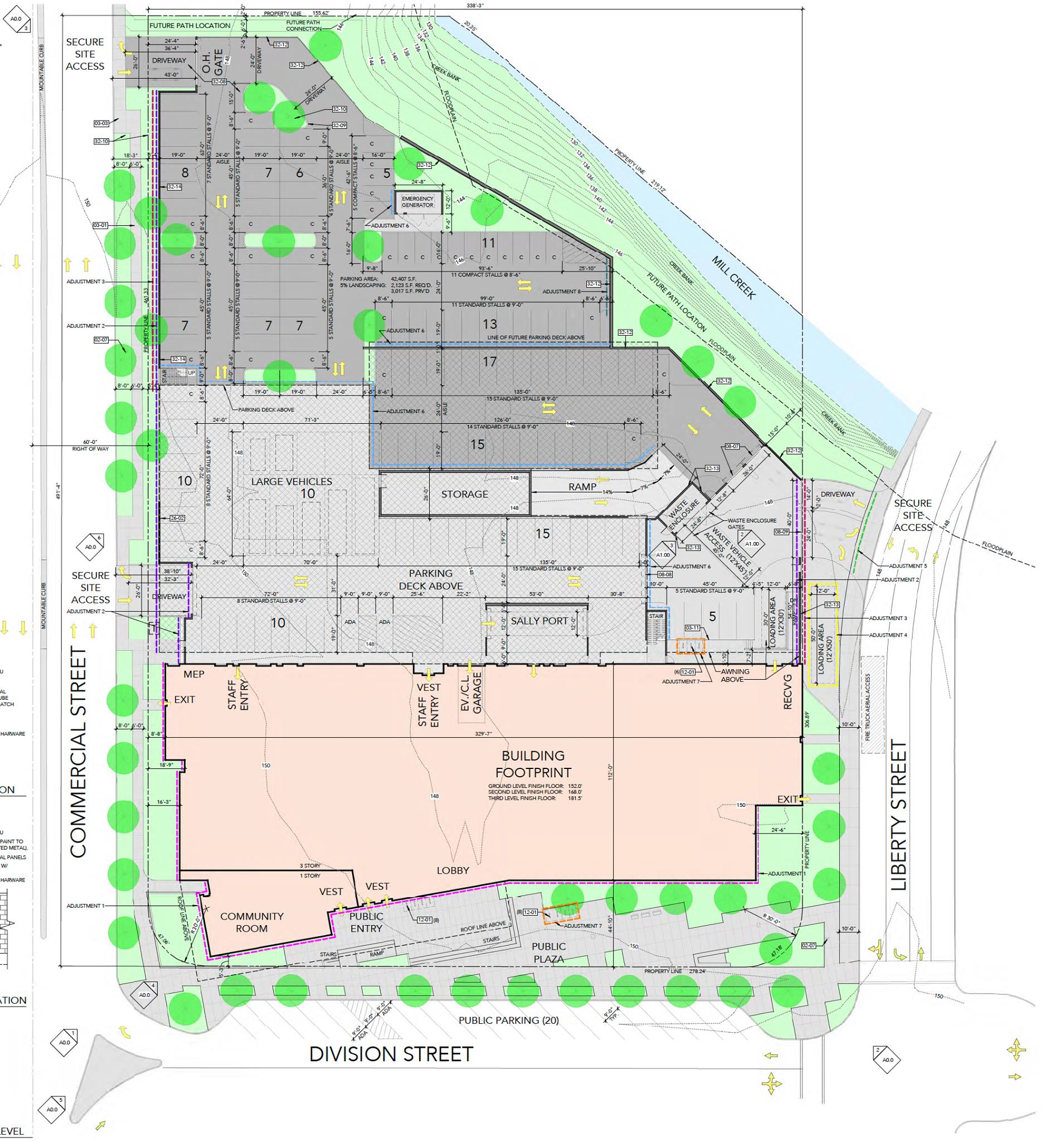 POLICE STATION … It's getting worse! Today the City released the newest site plan of the police facility for public comments during this next week on the current "Site Plan Review" phase. It is alarming to see the public walkway along the creek has suddenly disappeared.