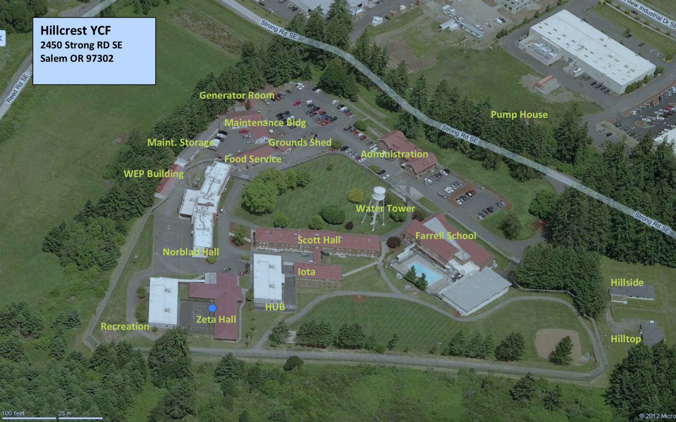 The former Hillcrest Youth Correctional Facility is located in southeast Salem, Oregon at the southeast corner of Reed and Strong roads (2450 Strong Road SE). This 44.6 acre property includes 207,000 square feet of rentable building space on the 23.8 acre developed campus. The remainder is undeveloped land, a forested slope of 11.8 acres, and a flat parcel of 9.0 acres. It includes 17 buildings. Utilities provided to the property include natural gas, electricity and city sewer. Water service is provided by a well located off-site and a 48,000 gallon water tower is located on the property.