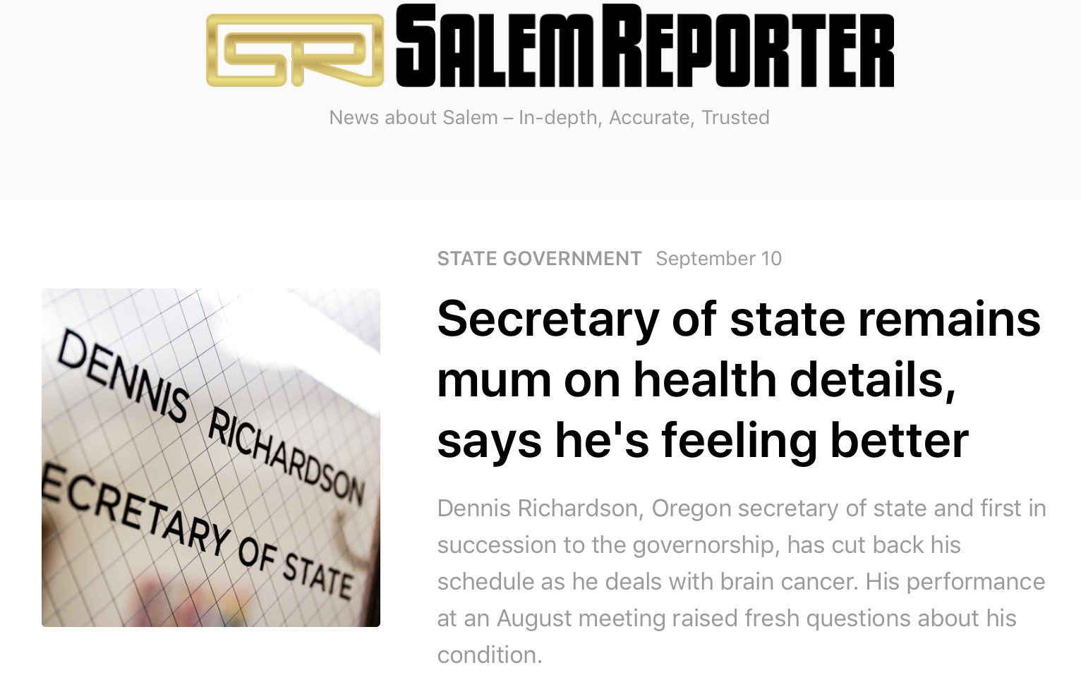 Not the Oregonian, not the Statesman Journal, nobody, to my knowledge. Congrats to Salem Reporter for having the journalistic fortitude to write about Richardson's medical problem so informatively, and without sensationalizing it.