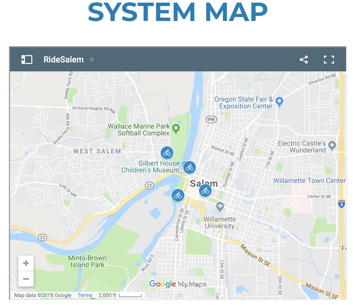 The Cycleshare web site shows the location of four stations. A Statesman Journal story says these will be at: Salem's Riverfront Carousel, the Union Street Railroad Bridge, Courthouse's West Salem location and the Downtown Transit Center.