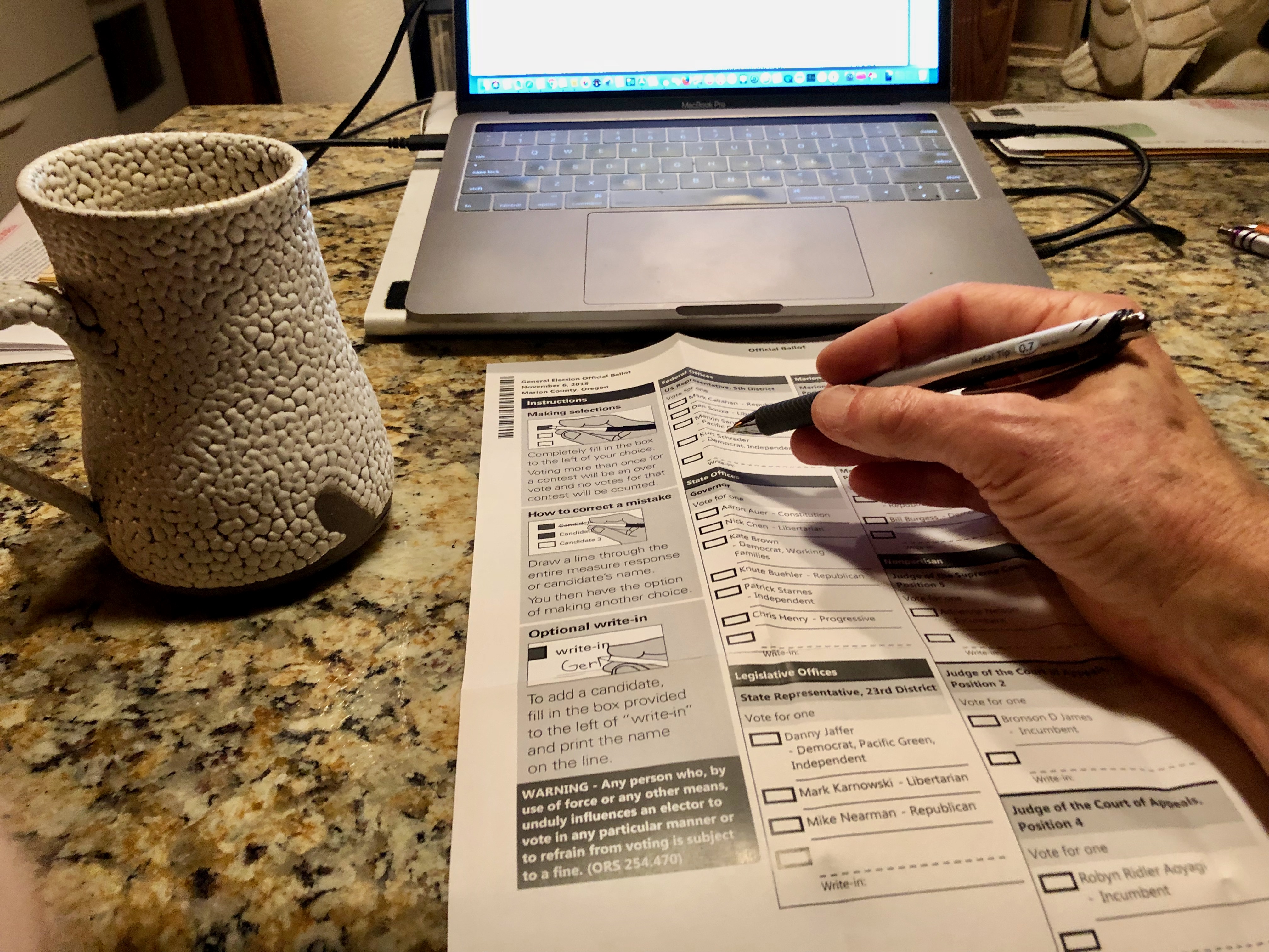 My ballot for the November 6, 2018 election arrived in the mail a few days ago. Tonight I sat at our kitchen counter, coffee and pen at the ready, and filled in the ballot.