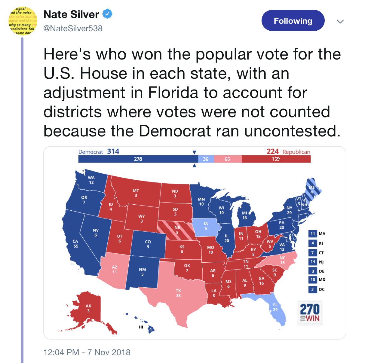 First, an encouraging tweet from Nate Silver. It shows that if a presidential election happened with which party won the popular midterm vote in each state, the Democrat would have won the presidency with 314 electoral votes. Great news for 2020!