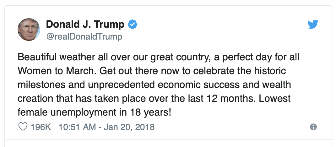 Screen Shot 2019-01-10 at 3.29.03 PMUm, no, the women aren't celebrating your supposed accomplishments, narcissist that you are. They're protesting you!