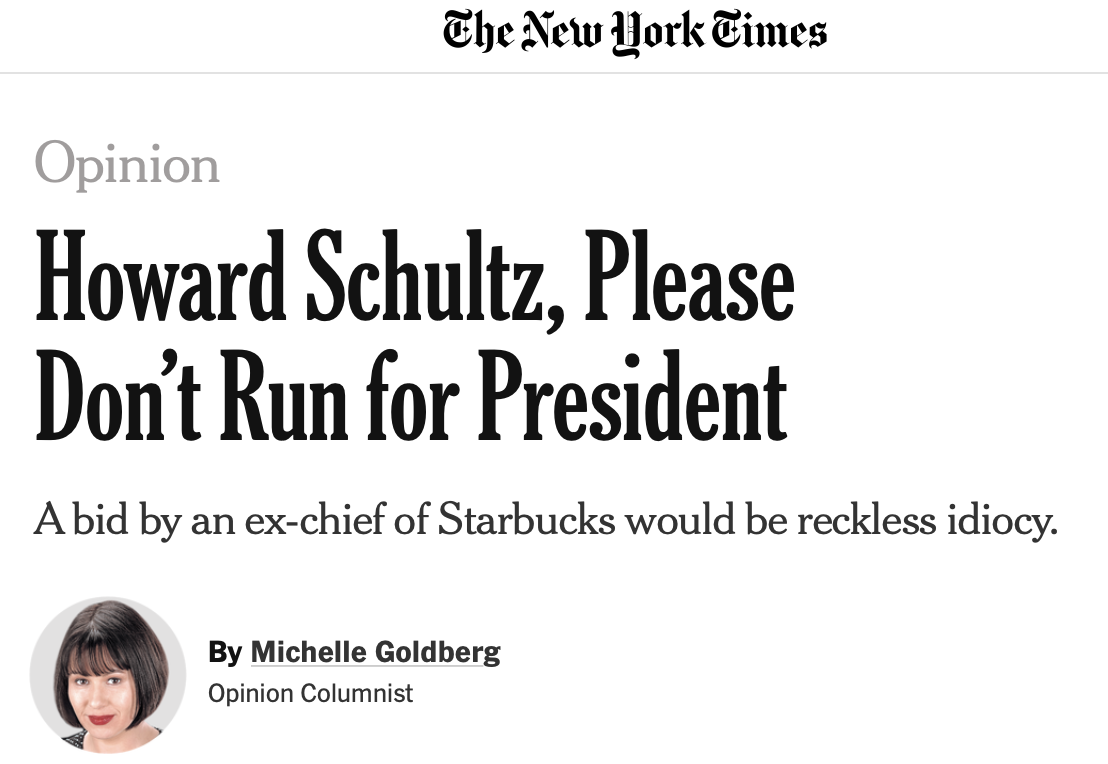 If you need persuading that Schultz could tilt the 2020 election to Trump, read a New York Times opinion piece, "Howard Schultz, Please Don't Run for President." Excerpt: