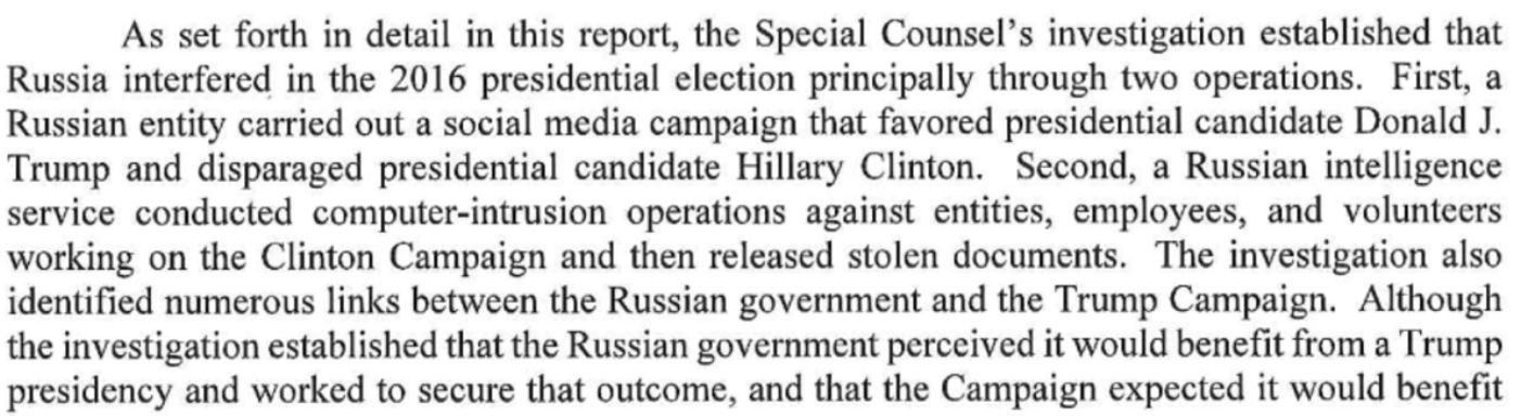 Russian interference in the election is undeniable. Page 1 of the report makes this clear, as shown above. The Russians favored trump and disparaged Clinton. Russia stole documents from the Clinton campaign, which then were released by WikiLeaks.