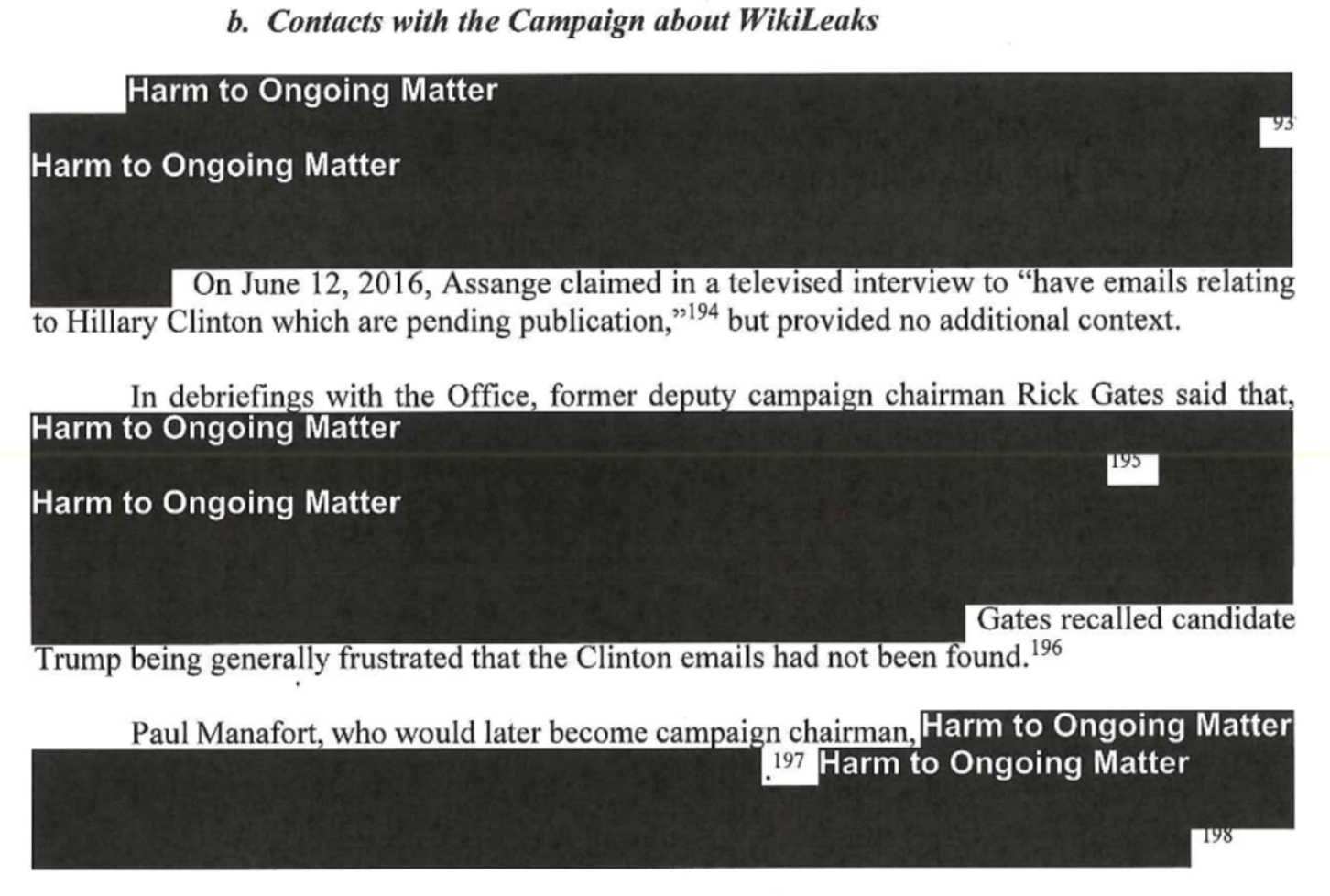 Investigations are ongoing. Even a cursory review of the report shows numerous mentions of "Harm to Ongoing Matter," or HOM — such as this section regarding the Trump campaign and WikiLeaks.