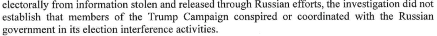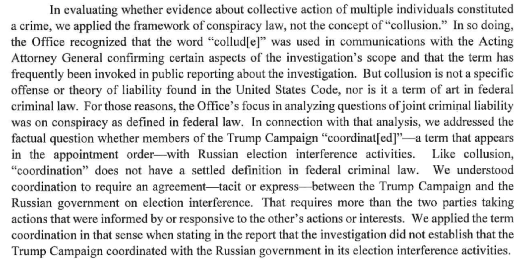 Collusion, yes; conspiracy, no. Above is a screenshot from page 2 of the Mueller report. Trump and Barr have been (figuratively) screaming No collusion! However, Mueller made clear that collusion, or even coordination, don't have settled definitions in federal criminal law.