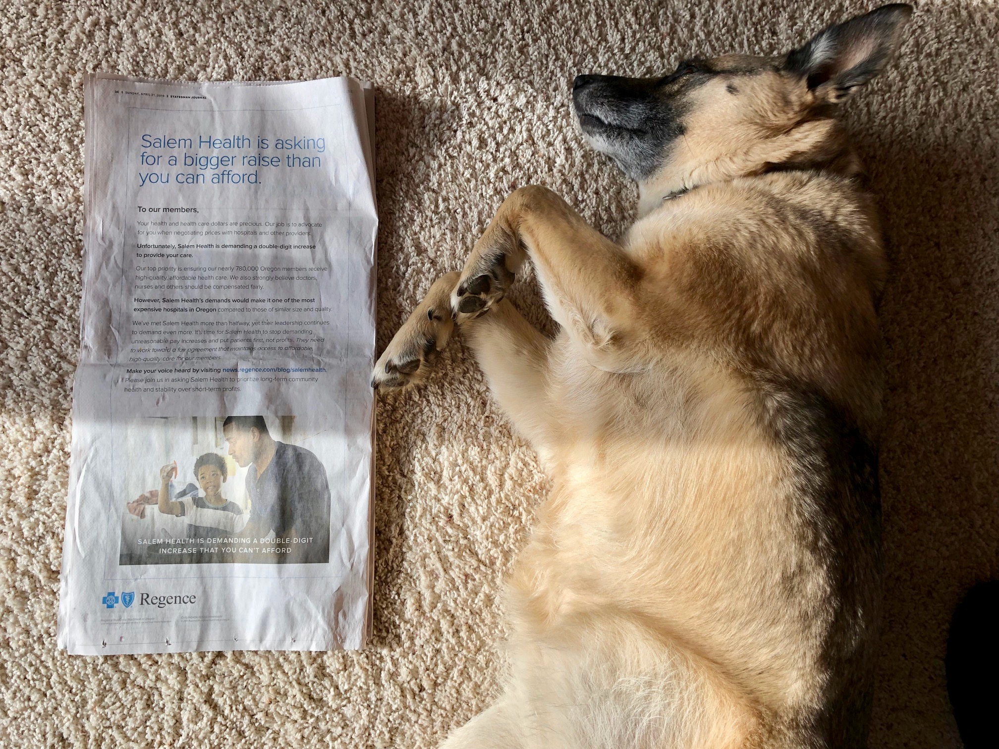 But if I wasn't aware of it before, a full page Regence ad in last Sunday's Statesman Journal (April 21) made the contract impasse difficult to miss. Heck, it was two-thirds the length of our dog!