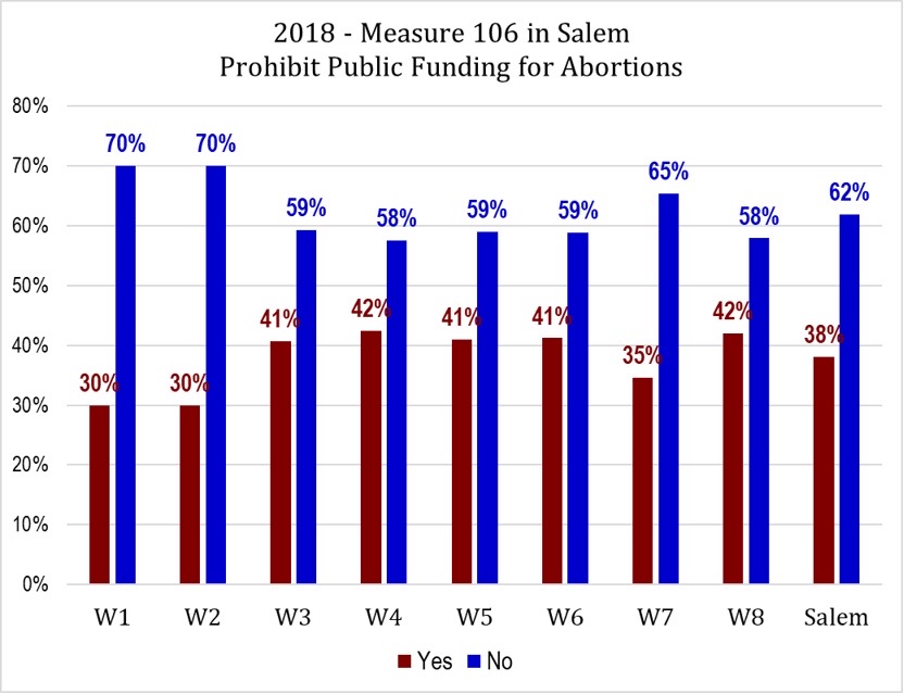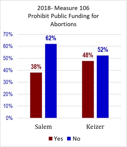 UPDATE: I've gotten results for Salem and Keizer on 2018's Oregon Measure 106, which would have banned public funds from being used on abortions unless necessary to save a woman's life. It was defeated statewide by about 64% No and 36% Yes.