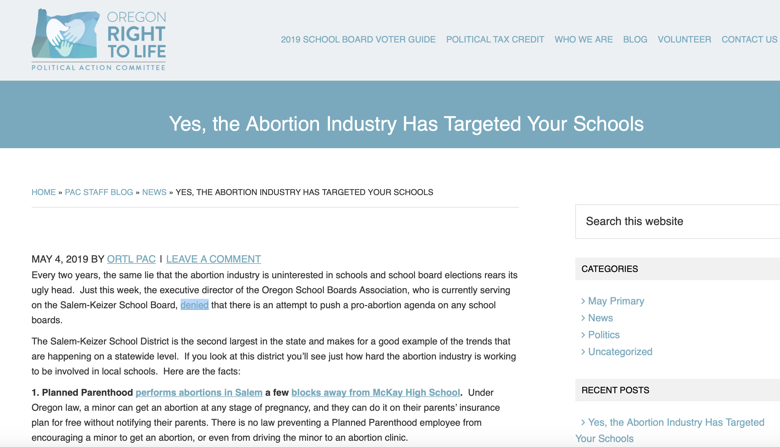 Extremist, because Oregon Right to Life is a fanatical single-issue group that fantasizes Planned Parenthood is plotting to get its tendrils into the Salem-Keizer School District in order to enrich itself by foisting abortions on students.