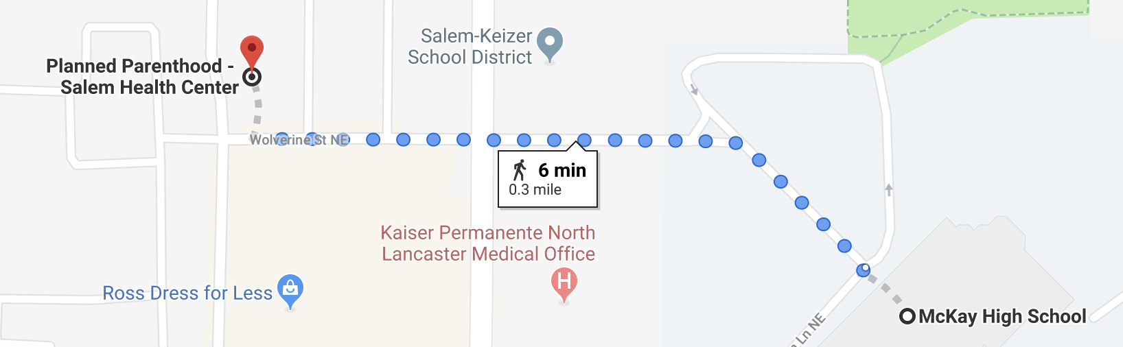 Part of the proof presented by Oregon Right to Life is a Google Maps image that shows a Planned Parenthood clinic in Salem indeed is several blocks away from McKay High School.