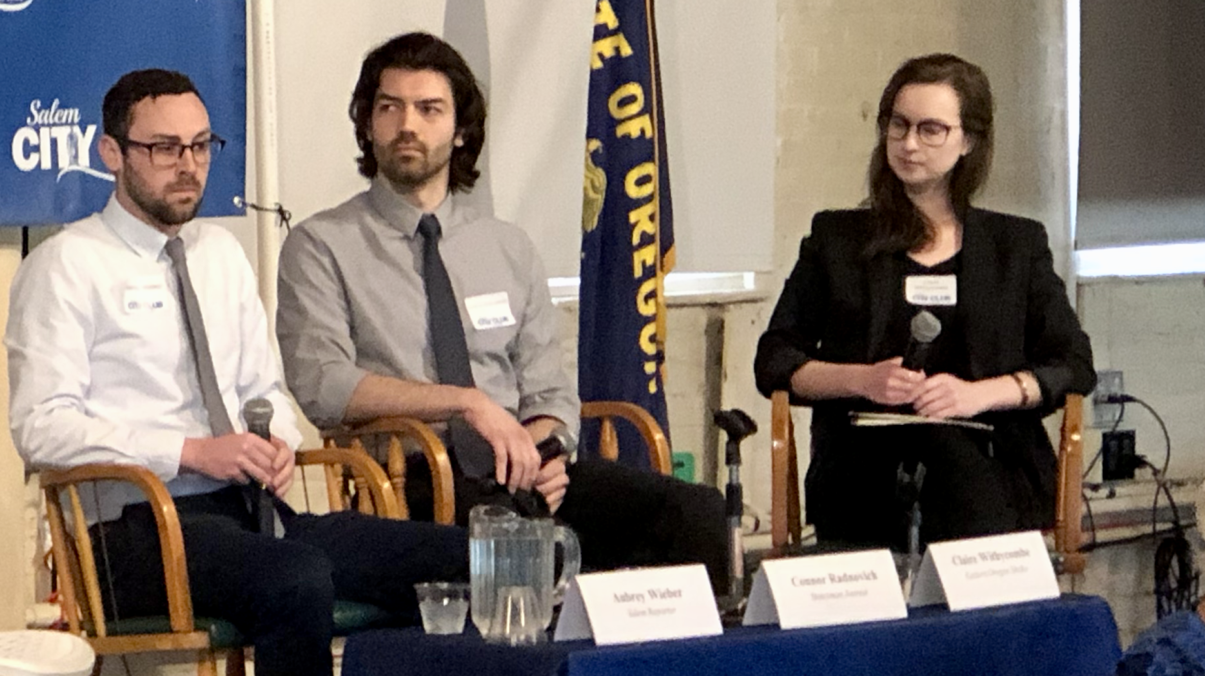 (From left to right: Aubrey Wieber of the Salem Reporter; Connor Radnovich of the Statesman Journal; Claire Withycombe of the East Oregonian and Salem Reporter — who was filling in for Hillary Borrud of the Oregonian, whose editor called her away at the last moment for some other duty.)